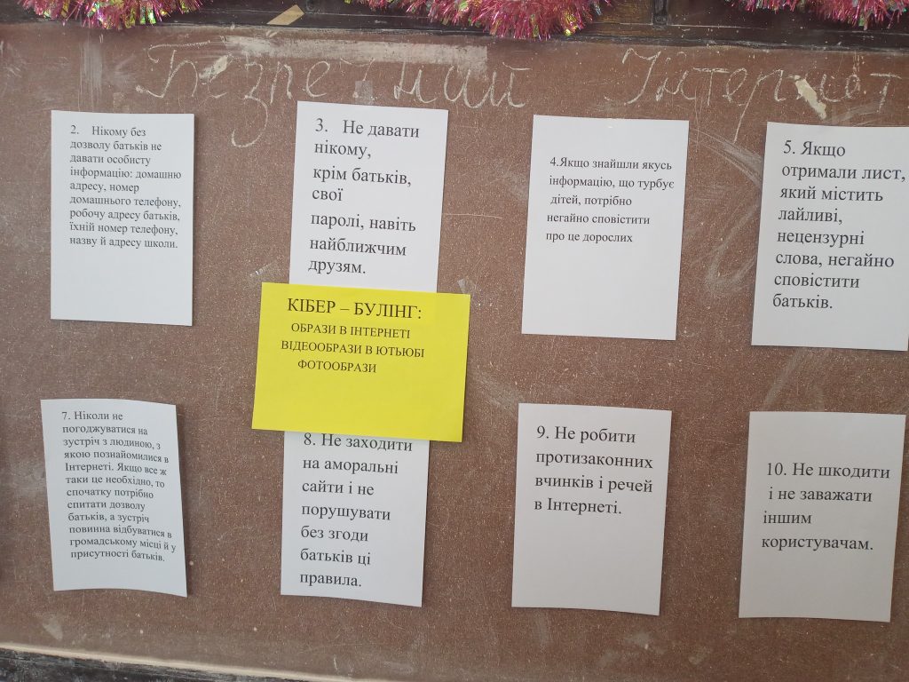 На занятті психологічна служба провела вправи : ” Моя онлайн – безпека ” , ” Правда чи неправда ” , обговорила з дітьми поняття ” приватність ” та правила безпечної поведінки в Інтернеті . П’ятикласники активно працювали на занятті та разом підготували стінівку .