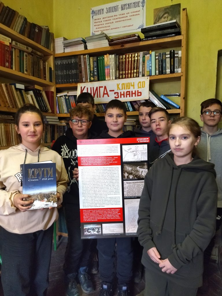 Завідуюча бібліотекою розповіла гуртківцям про героїчний подвиг київських студентів під Крутами, про історію, що вмита кров’ю і сльозами.