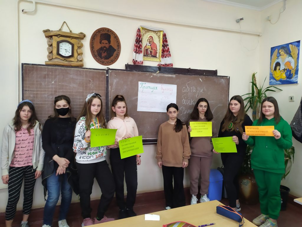 Учнів ознайомлено з поняттям «булінг», пояснено причини та наслідки жорстокої поведінки. На занятті проводились вправи «Чим ми схожі, чим ми різні?», «Чому так стається?», «Мої емоції – мої вчинки».
