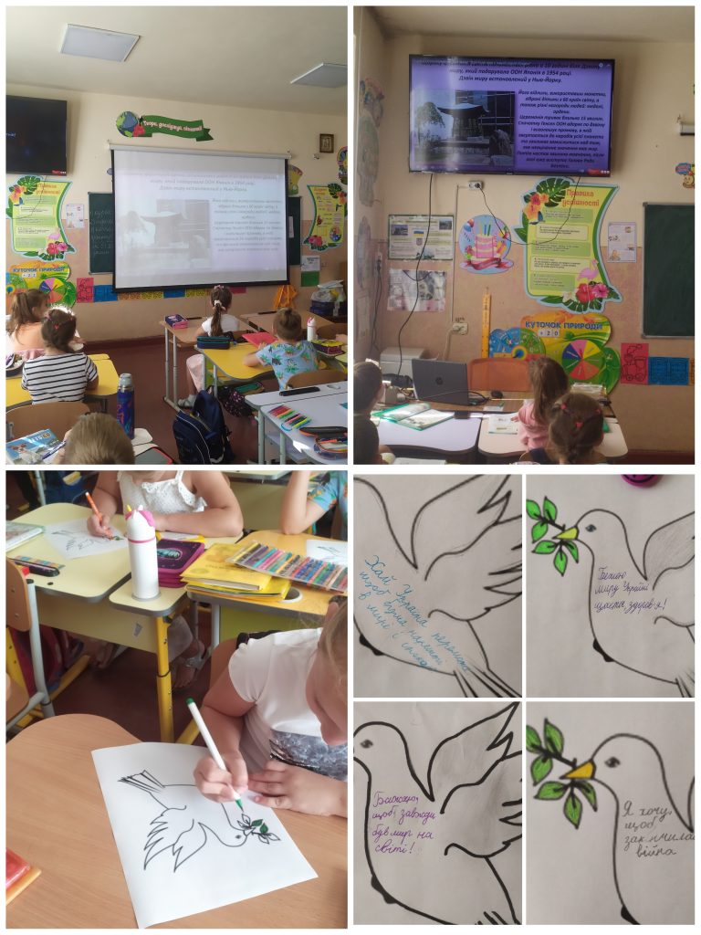 Сьогодні кращі українські  сини боронять нашу землю, відстоюють мирне життя для нашого народу. Тому зараз, як ніколи, для кожного з нас мир – найбільша і найважливіша цінність, яка є запорукою щасливого життя кожної української родини.Учні 3-Б класу Суховільського ліцею (кл. керівник Барна О.М.) дізналися про білого голуба, який вважається символом миру, про Дзвін миру, що встановлений у Нью-Йорку,  а також виготовили на уроці паперових голубів, на яких написали свої щирі побажання.