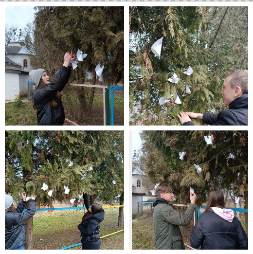 Учасники учнівського самоврядування ліцею приготували і розвішали на шкільному подвір’ї паперових ангелів, які символізують душі загиблих борців за свободу та перемогу світла над темрявою.