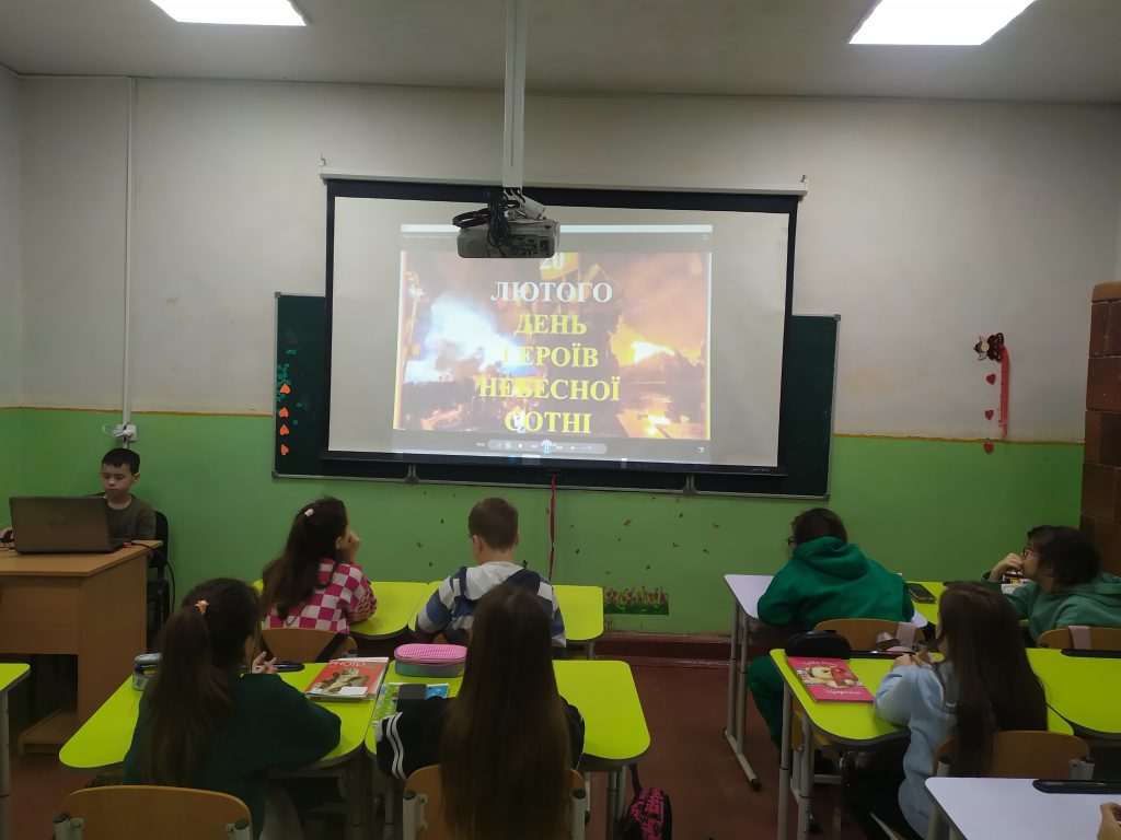 Панько Н.Р. пояснила учням, чому сьогодні ми в скорботі, звернула увагу дітей на те, що Герої Небесної Сотні віддали своє життя, захищаючи ідеали демократії. Діти більше дізнались, як у 2014 році у центрі Києва було цинічно розстріляно беззбройних людей. Шестикласники сумно читали поезію Нелі Кінзерської, розуміючи, яку високу ціну заплатили Ангели Майдану за наше життя у свободі.