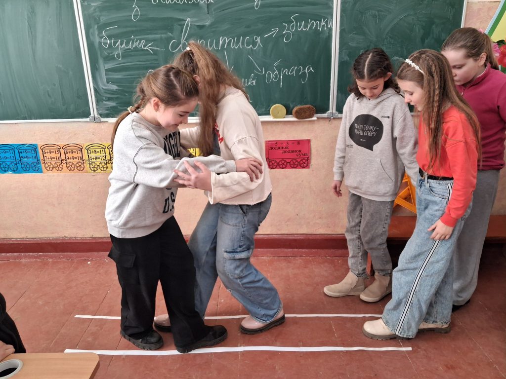 На занятті діти підбирали синоніми до слова «сваритися», виконували вправи «Прохід над прірвою», «Зустріч», розв’язували конфліктні ситуації.