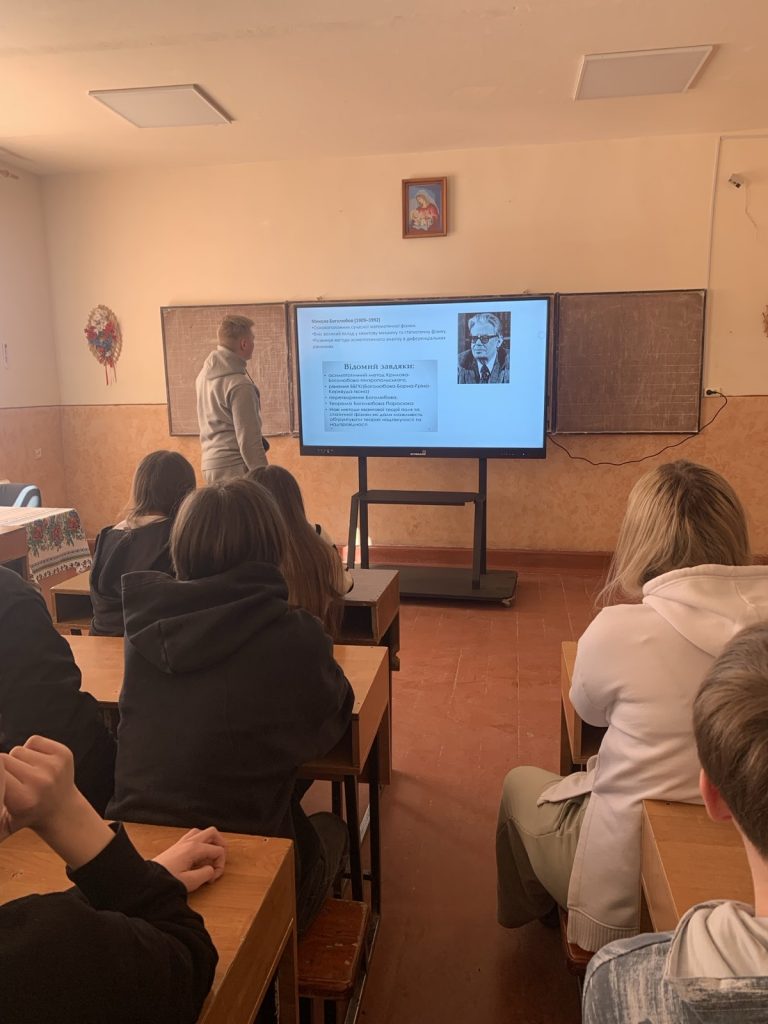 У вівторок учні 10-х та 9-Б класу переглядали презентації «Видатні українські математики та їхній внесок у розвиток світової науки», «Математика в повсякденному житті» та «Математика в природі», які підготували учні 10-Б класу.